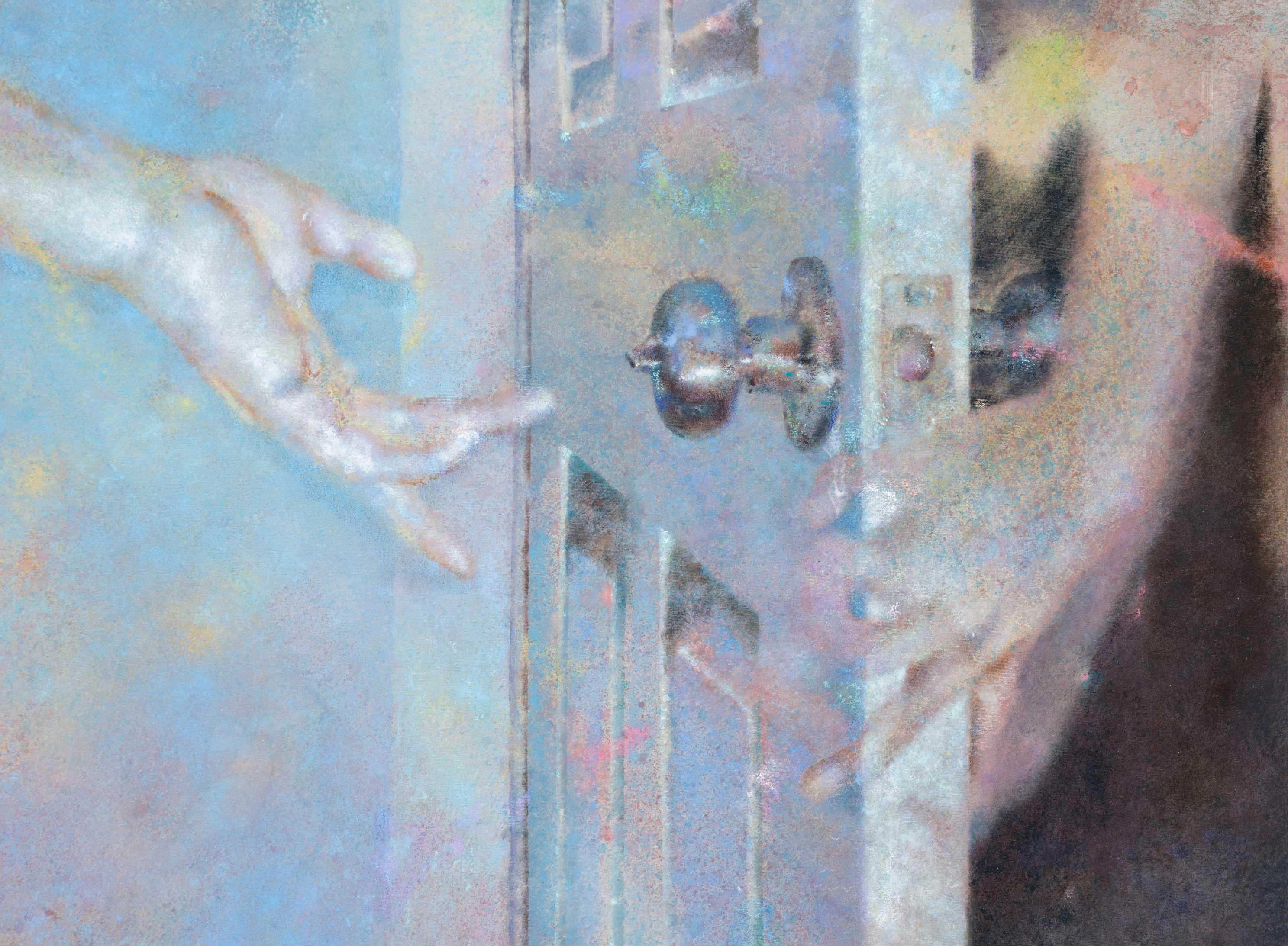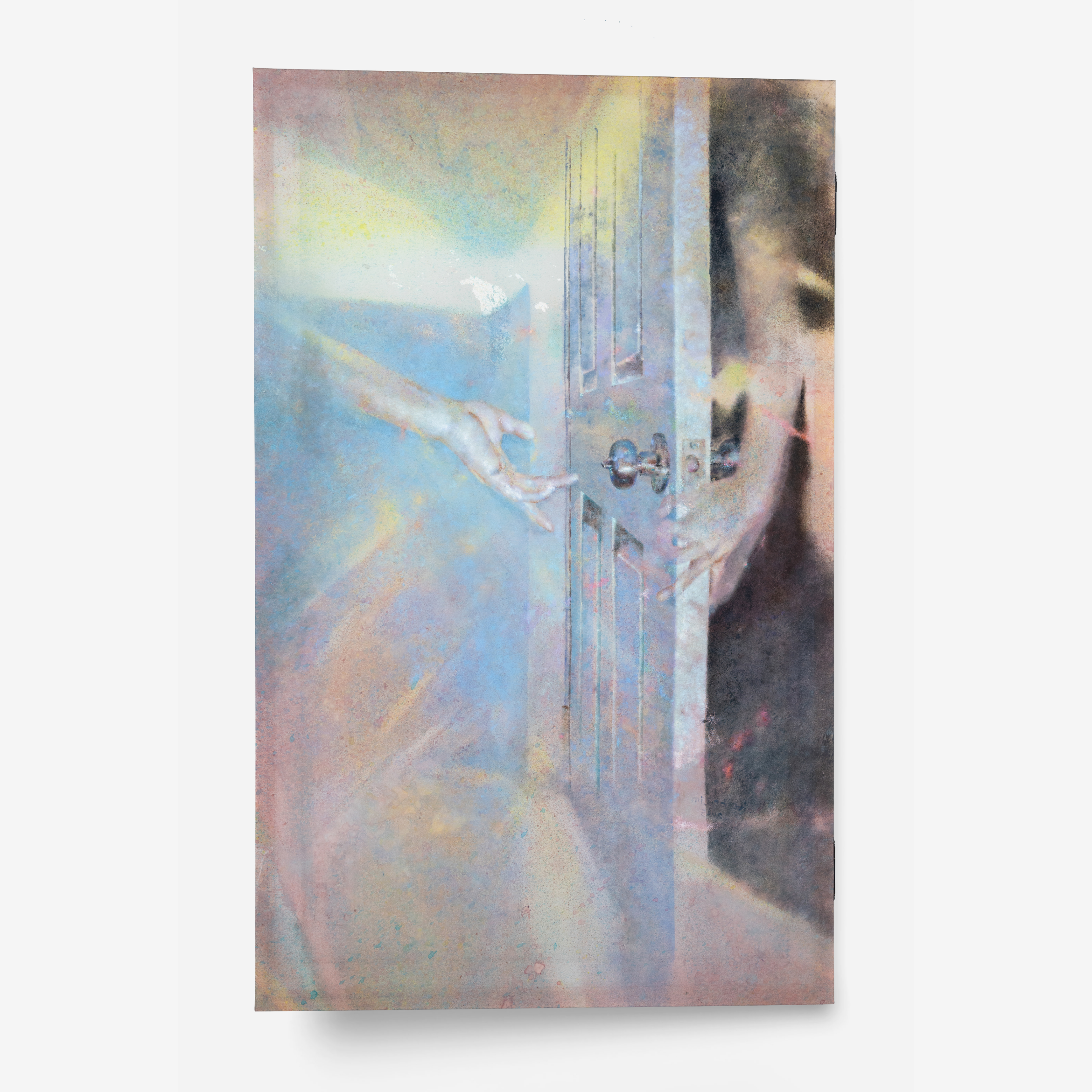 Acrylic on silk, mounted on aluminum stretcher bars with two vintage hinges attached
