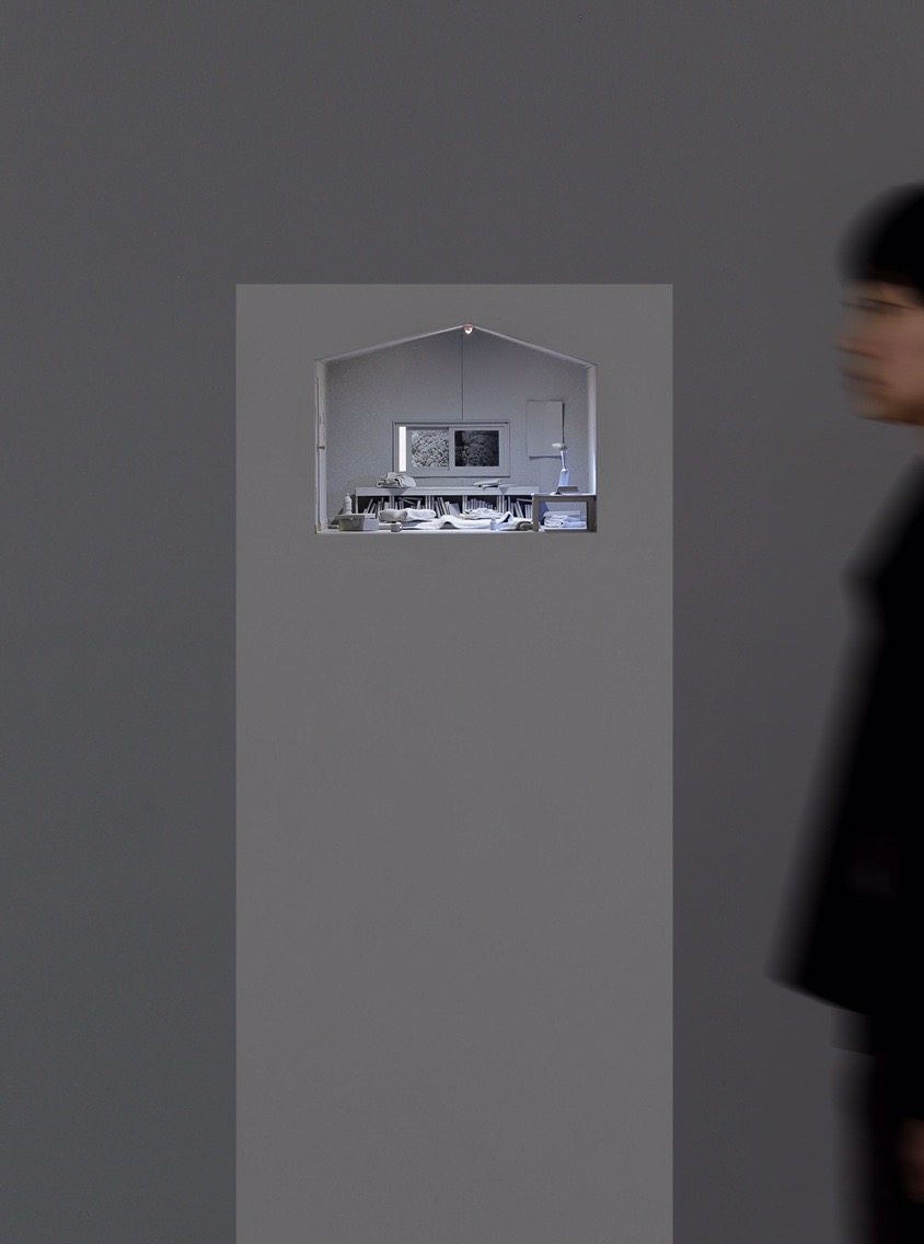 The project, composed of two artworks, focuses on the hypocrisy indefining a boundary. The black-and-white video first appears upon entering the exhibition entitled <Dream of Dream House>. The mist and house in the video allude to the boundary and the character veers between the mist and house to either heighten ordestroy the boundary.