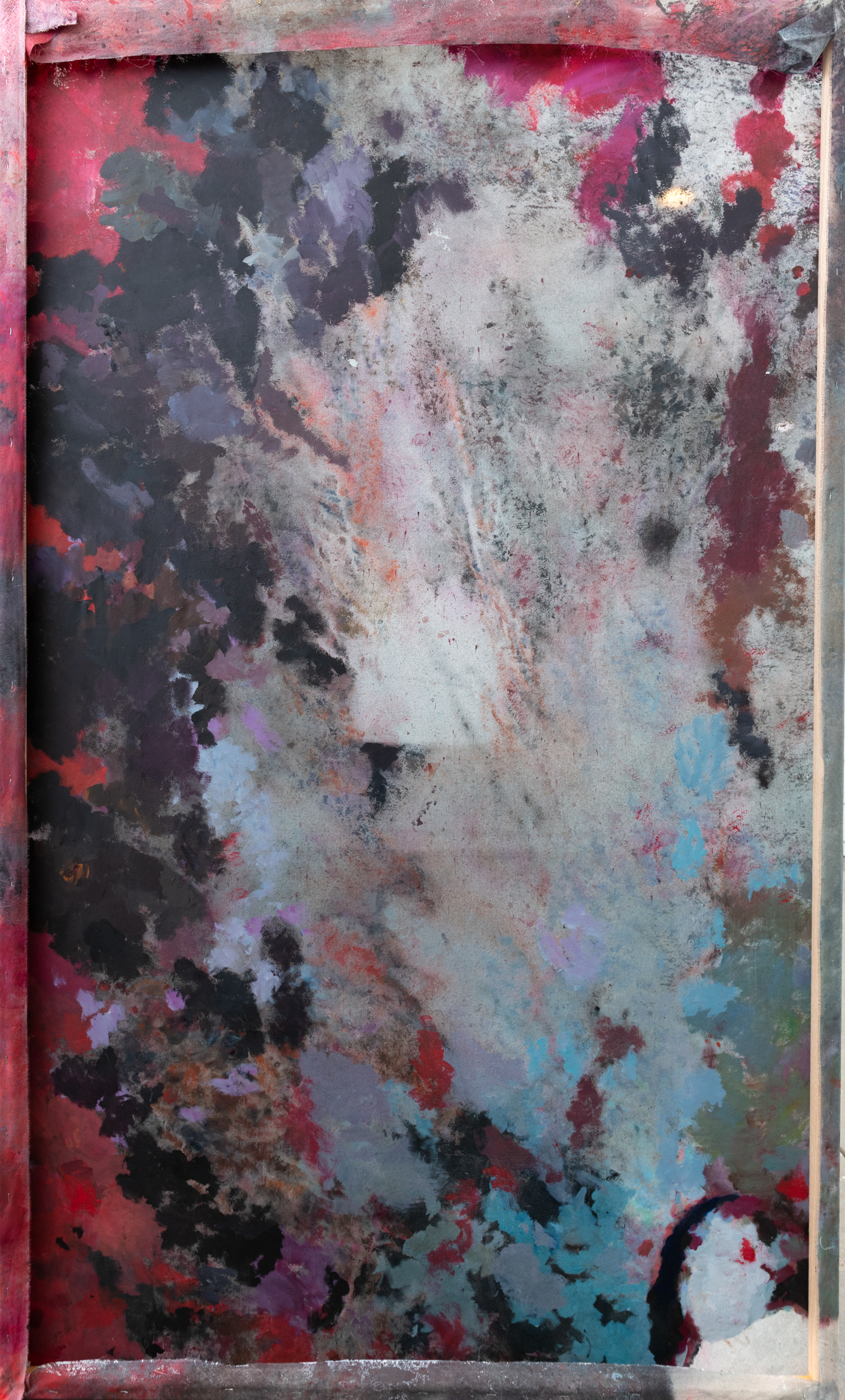 Acrylic, pigment, colored pencil, oil on silk, mounted on handrail stretcher bars